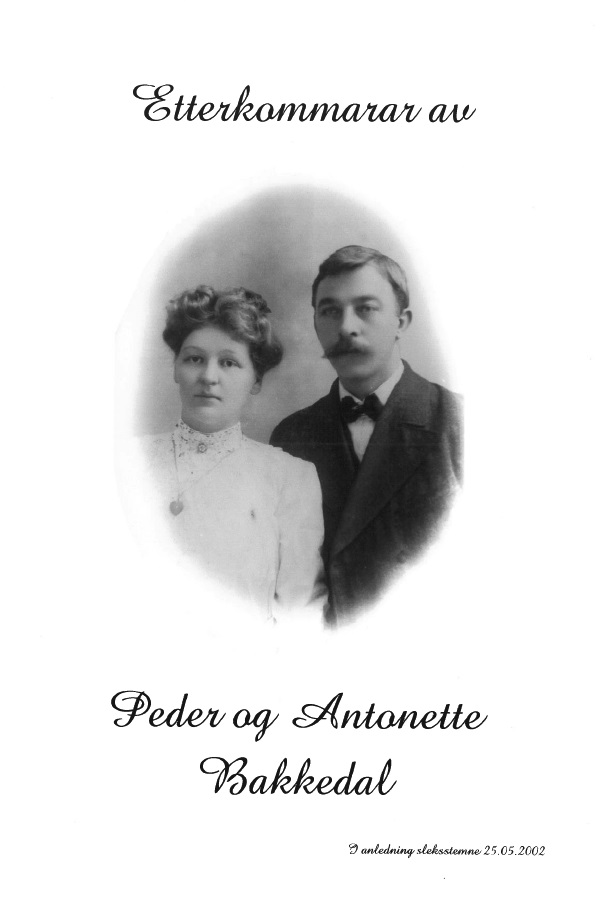 | Slektshistorie | ![]() | Etterkommarar av Peder og Antonette Bakkedal Etterkommarar av Peder og Antonette Bakkedal ble laget i anledning slektsstemne 25.05.2002 Hefte er laga av Ove Jonny Ohm og Øyvind Bakkedal var med og samla opplysningar. Skannet av Anita Skeie Vormestrand. |